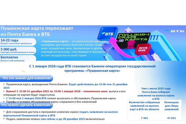 С 1 января 2026 года оператором программы «Пушкинская карта» определен Банк ВТБ