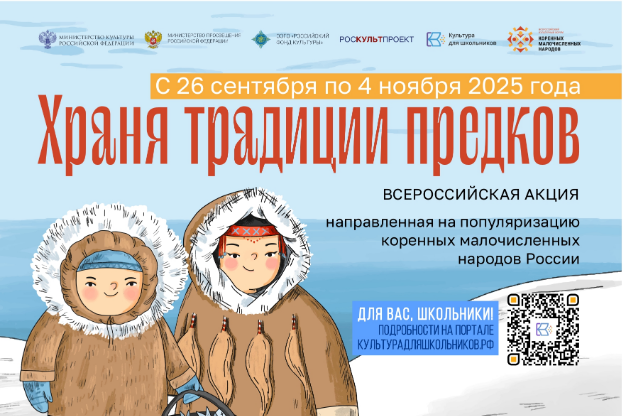 Всероссийская акция «Храня традиции предков» Конкурс пройдёт в трех номинациях:- «Живое наследие» (участникам предлагается поделиться своими знаниями о традициях малочисленных этносов);- «Наследники мудрости» (специальная категория для школьников, принадлежащих к коренным малочисленным народам, где они смогут рассказать об уникальности своей культуры);- «Шаги навстречу культуре» (участникам предстоит поразмышлять о значении культуры каждого народа для сохранения нематериального наследия и о личном вкладе в сохранение народных традиций). Чтобы принять участие, необходимо подготовить работу в одной или нескольких предложенных категориях в формате эссе, видео или презентации (на выбор) и зарегистрироваться на портале «Культурадляшкольников.РФ». Приём заявок завершится 4 ноября 2025 года – в День народного единства. После завершения акции экспертное жюри определит 100 лучших работ, которые будут опубликованы на портале «Культурадляшкольников.РФ» в ноябре 2025 года. Акция организована в рамках проекта «Культура для школьников» и Всероссийского культурного форума коренных малочисленных народов России. Не упустите возможность стать участником!