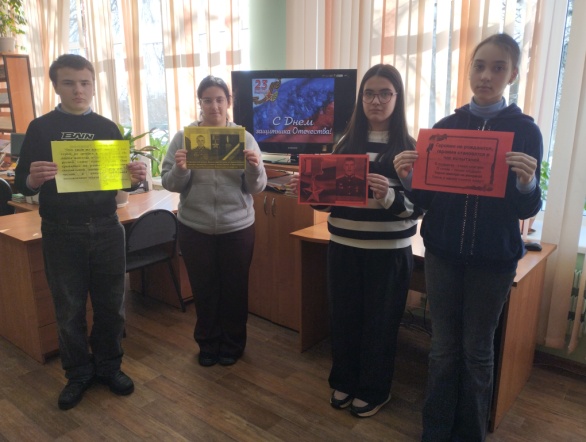 19 февраля в библиотеке № 3 им. Б.Л. Васильева в рамках реализации проекта по патриотическому воспитанию «О Родине, о мужестве, о славе» и корпоративного проекта «Россия в пространстве и времени» для обучающихся 6 класса МБОУ «СШ № 30 им. С.А. Железнова» состоялся патриотический час «Герои нашего времени», посвященный Дню защитника Отечества.
