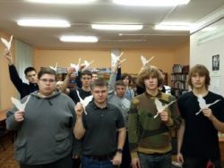 Юноши и девушки ответили на вопросы викторины «Зов белых журавлей», показав знания по военной истории Отечества, а также приняли участие во флэшмобе «Журавли нашей памяти».