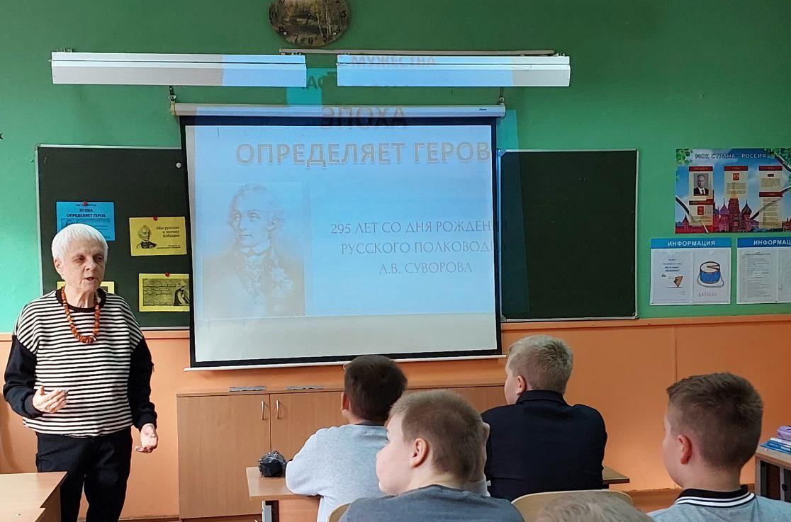 6 ноября библиотека № 11 им. В.Е. Рудницкого провела для обучающихся 5-х классов МБОУ «СШ № 1» час мужества «Эпоха определяет героев», посвященный 295-летию со дня рождения русского полководца А. В. Суворова.