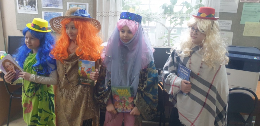 Девочки приняли участие в дефиле: модели проходили по читальному залу, демонстрируя наряды из коллекции вещей, предложенных сотрудниками библиотеки – парики, шапочки, платки.