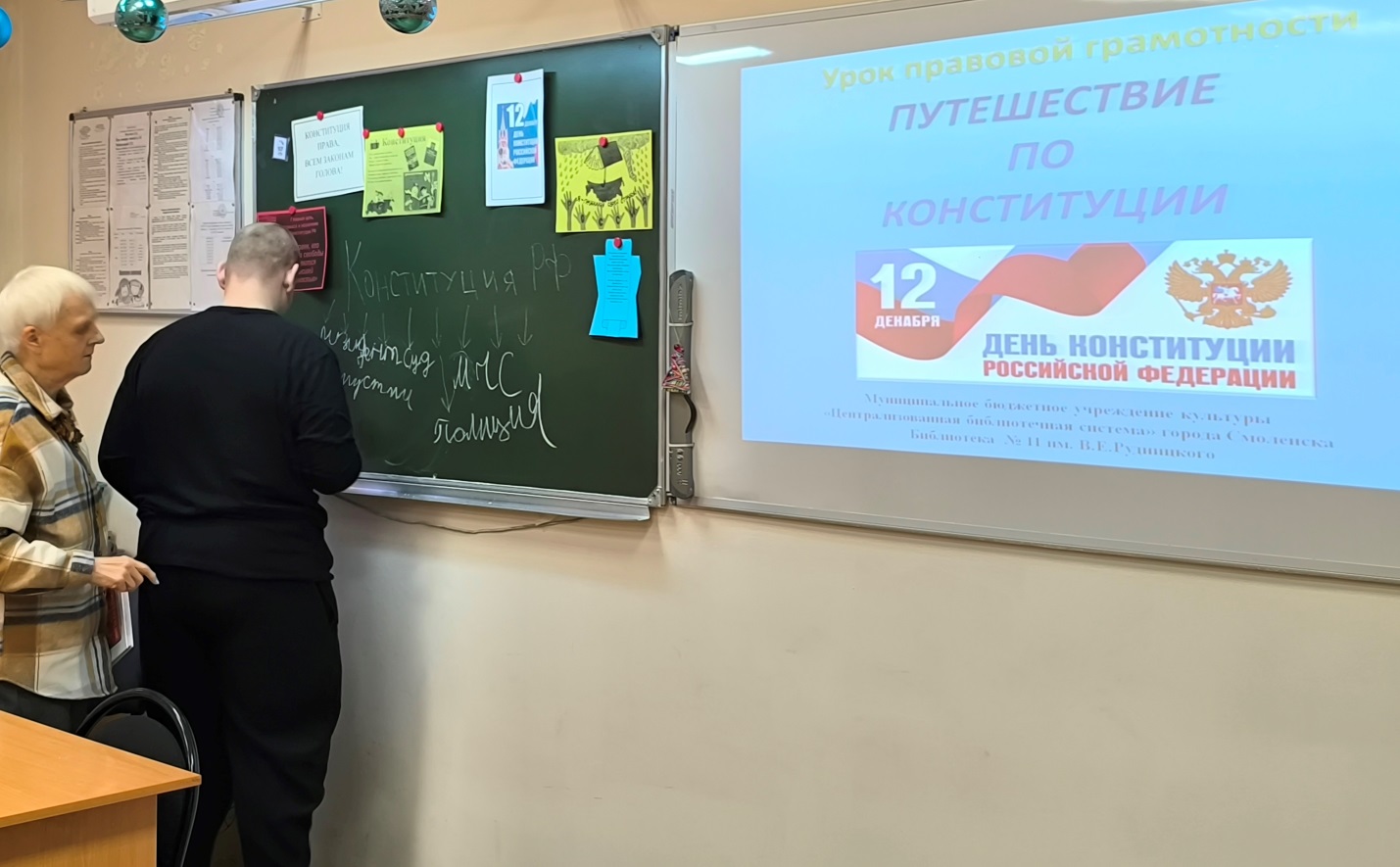 8 декабря работники библиотеки № 11 им. В.Е. Рудницкого провели для обучающихся ОГБОУ «Центр образования и развития «Особый ребенок» г. Смоленска урок правовой грамотности «Путешествие по Конституции».