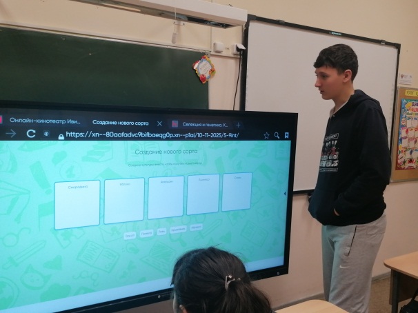 В рамках интерактивного задания «Создание нового сорта» подростки проверили и закрепили свои знания о селекции. Кроме того, они познакомились с вкладом других отечественных учёных – В. С. Пустовойта, А. Л. Мазлумова, Л. А. Жданова и других, чьи открытия «кормили» и продолжают «кормить» всю страну.