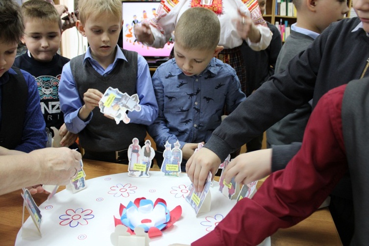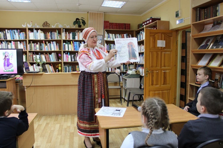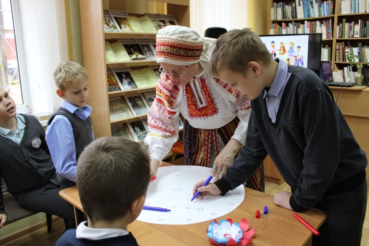 В ходе обсуждения подготовки к праздникам, школьники вспомнили о традиционной праздничной одежде. С помощью красочной слайд-презентации они познакомились с русским народным костюмом, а календарь, выпущенный Смоленским государственным музеем-заповедником, продемонстрировал им великолепие народных костюмов различных районов Смоленской области. Далее, проявив смекалку, юные участники из набора перемешанных слов составили два лозунга: «Мы разные, но мы вместе!» и «Народов много – Родина одна!».