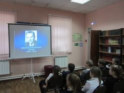 Библиотекарь на фоне слайд-презентации «Весёлый писатель Н. Носов» рассказал, как и почему Николай Николаевич стал детским писателем, о том, где он брал сюжеты для своих рассказов.